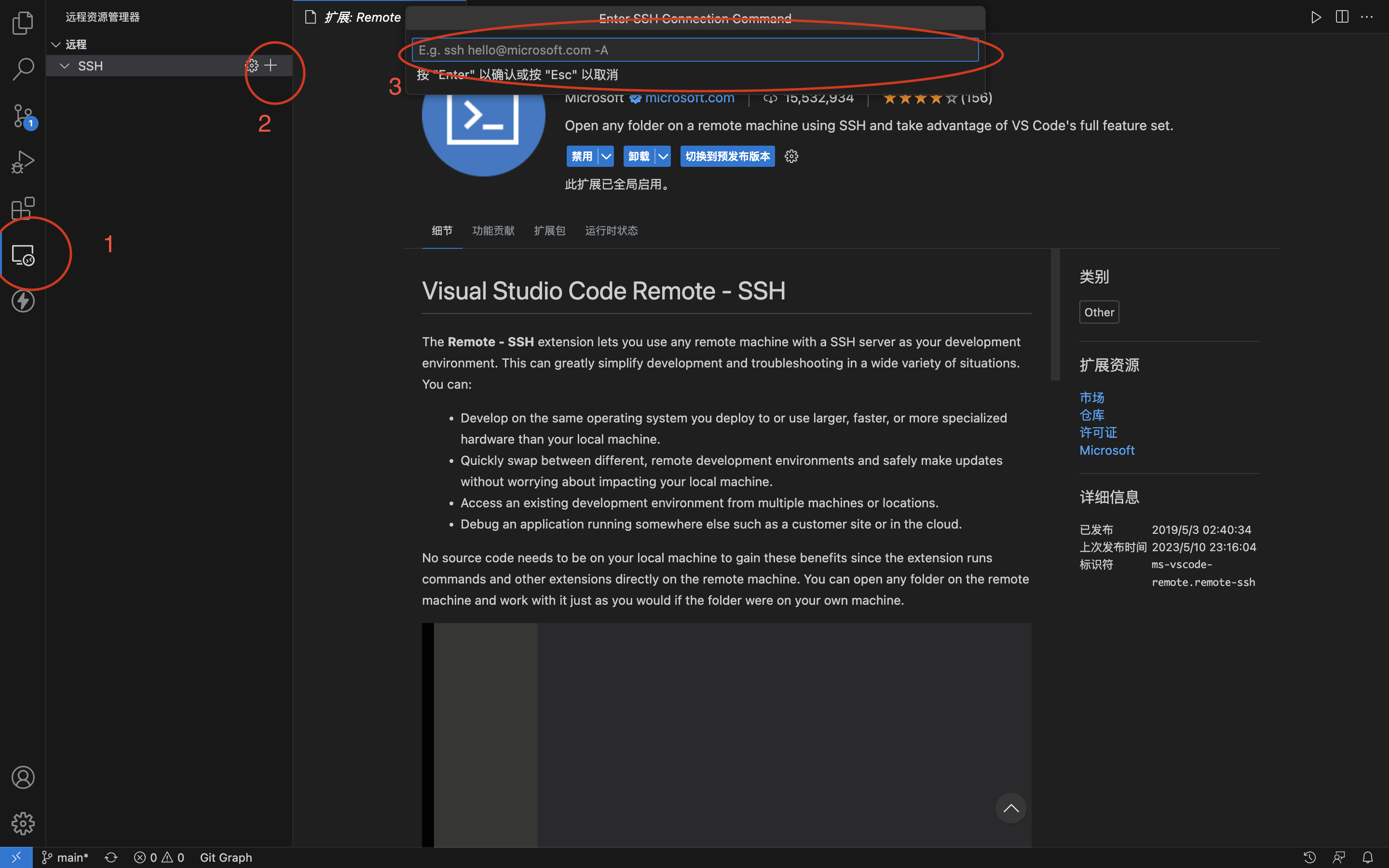 在插件里搜索 Remote SSH,安装后会在左侧菜单栏里出现一个远程资源管理器的图标,按照下图中的顺序,先点击图标,在点击“添加”,然后在弹出的输入框内按照提示的格式输入用户名和 IP 地址,按“Enter”保存到 config 文件中。